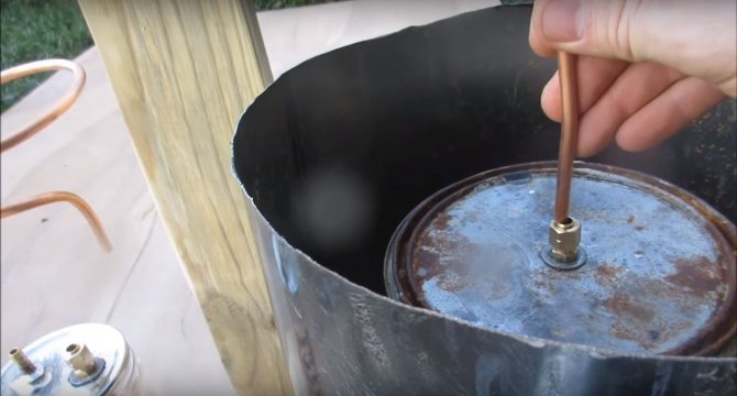 Installez deux canettes sur la plate-forme, l'auteur les fixe avec des vis autotaraudeuses. L'un des bidons est le corps de l'échangeur de chaleur et l'autre est le corps du filtre. Nous prenons l'un des couvercles et forons des trous. Ils sont équipés d'un raccord de tuyau et d'un raccord pour le tuyau en cuivre de l'échangeur de chaleur.