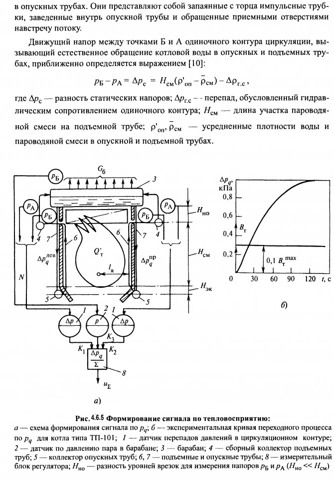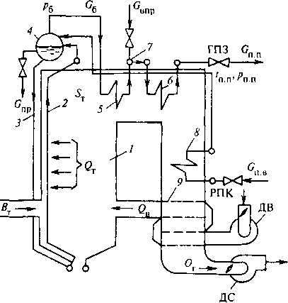Un diagramme schématique du processus technologique se déroulant dans une chaudière à vapeur à tambour est illustré à la Fig. 4.5.1. Le combustible entre par les brûleurs dans le four 7, où il est généralement brûlé par une méthode de torche. Pour maintenir le processus de combustion, l'air est fourni à la fournaise en une quantité QB.
