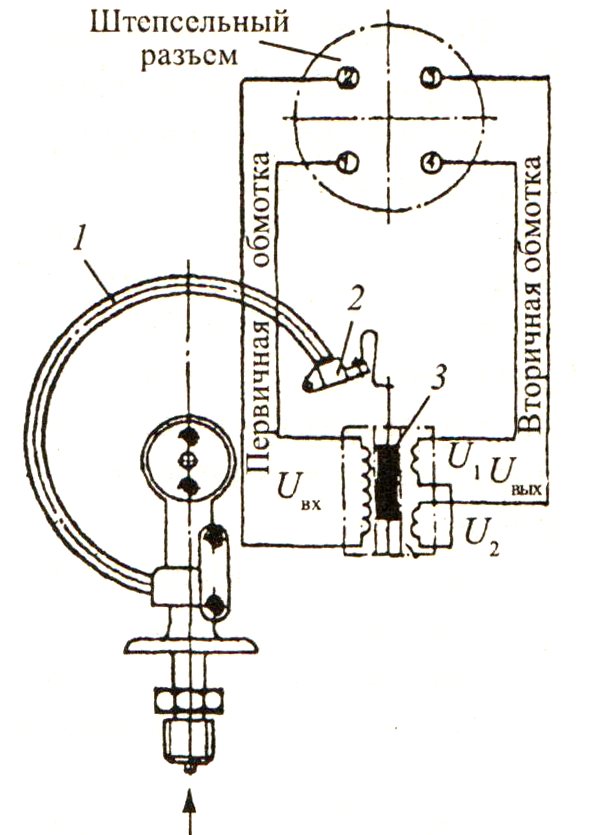 Figure. 130. Manomètre électrique à distance DER: 1 - ressort; 2 - extrémité libre du ressort; 3 - le noyau du convertisseur de transformateur différentiel