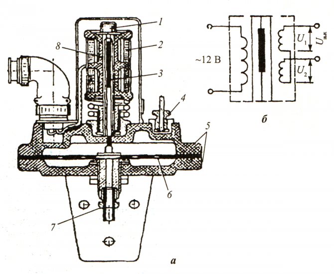 Figure. 131. Jauge de traction différentielle DT-2: dispositif de jauge de traction; circuit b-électrique; 1 - écrou; 2 - la bobine du convertisseur de transformateur différentiel; 3 - noyau du convertisseur de transformateur différentiel; 4, 7 - raccord; 5 - cas; 6- membrane; 8 - tube diviseur