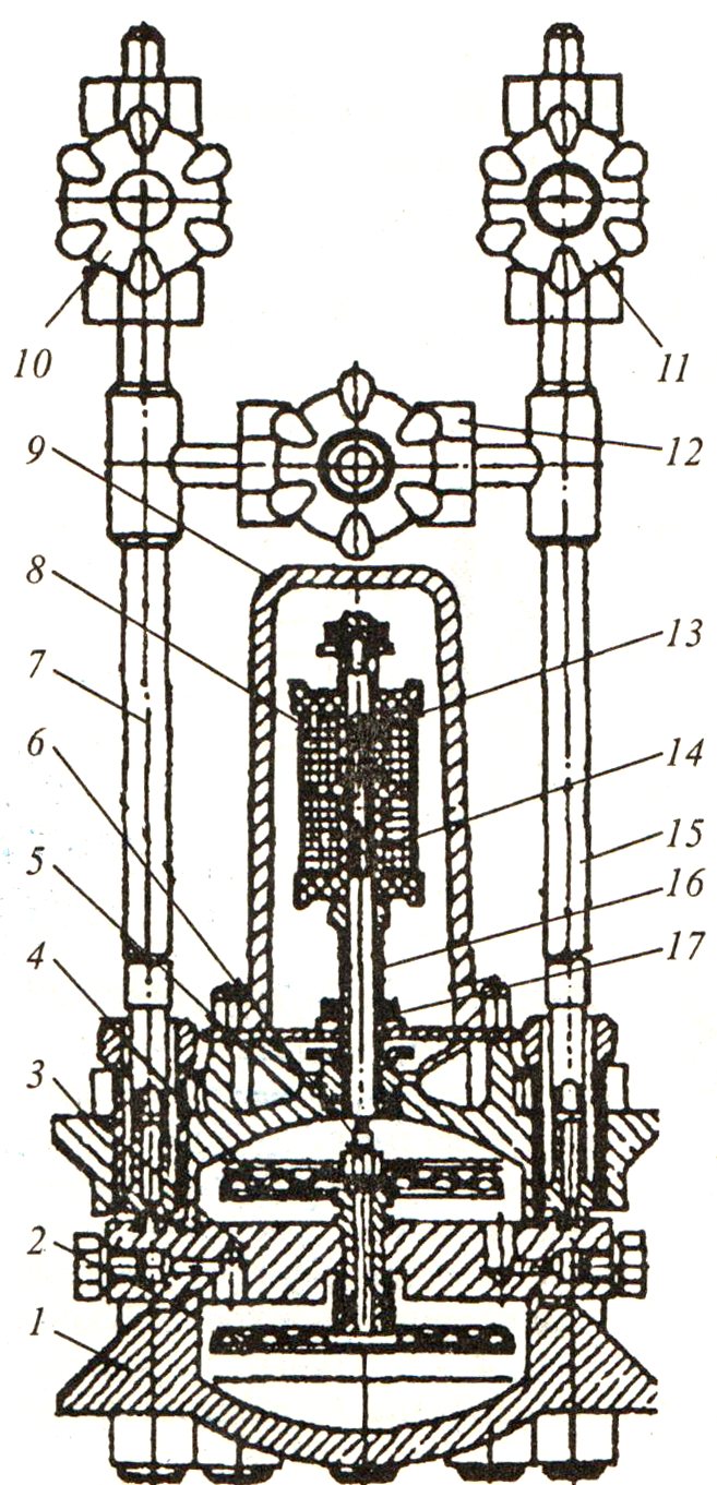 Figure. 132. Manomètre différentiel DM: 1,6 - couvercles de boîtier; Boîtes à 2,4 membranes; 3 - partition; 5 - mamelon; 7 et 15 - tubes à impulsions; 8 - convertisseur différentiel-transformateur; 9 - bouchon; 10, 11, 12 - soupape; 13 - tube de distribution; 14 - tige du noyau du convertisseur; 16 - douille de réglage du zéro; 17 - contre-écrou