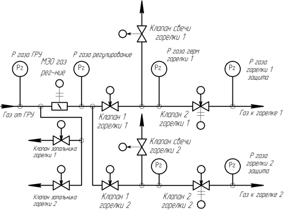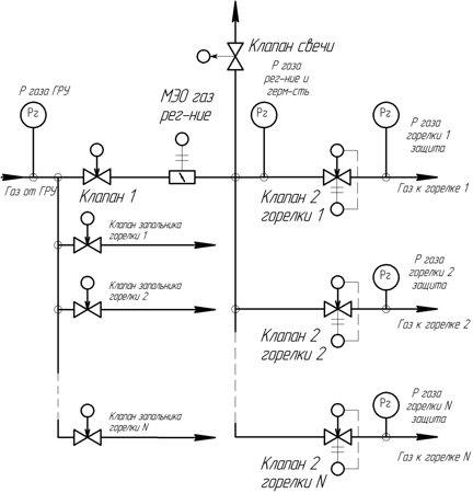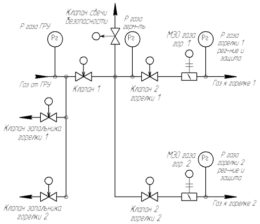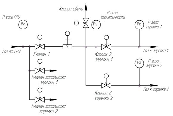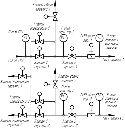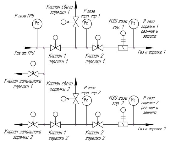 L'arrêt de sécurité du brûleur se produit lorsque l'un des événements est détecté: 1) augmentation / diminution de la pression du gaz devant le brûleur; 2) abaisser la pression du combustible liquide devant le brûleur; 3) abaisser la pression d'air devant le brûleur; 4) abaissement du vide dans le four; 5) une augmentation du niveau dans le tambour de la chaudière au-dessus du niveau d'urgence supérieur; 6) abaisser le niveau dans le tambour de la chaudière en dessous du niveau d'urgence inférieur; 7) augmentation de la pression de vapeur dans le tambour de la chaudière;