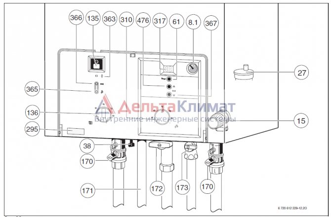 Au bas de toute chaudière à double circuit à charnière, il y a 5 buses. Ils sont connectés à: les conduites d'alimentation et de retour du système de chauffage, l'alimentation et le retour de l'alimentation en eau chaude, le gaz principal. L'entrée de gaz est généralement centrée et colorée en jaune. Toutes les autres conduites peuvent être disposées dans n'importe quel ordre, selon le modèle de la chaudière à gaz. Par conséquent, avant de commencer le cerclage, il est nécessaire de clarifier le but de chacun d'eux dans le mode d'emploi.