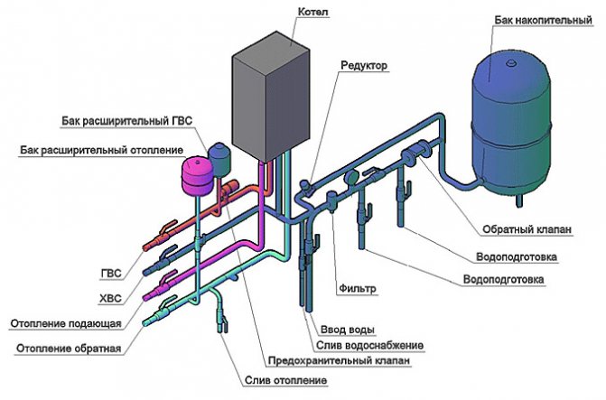 La tuyauterie d'une chaudière à gaz murale est réalisée avec des tuyaux en polypropylène ou en métal. La section transversale des tuyaux de chauffage est généralement plus grande que les tuyaux d'eau chaude sanitaire de 3/4 et 1/2 pouces, respectivement. Le système de chauffage est relié à la chaudière par les écrous «américains». Des vannes à bille sont installées sur chaque ligne, pour faciliter le démontage de la chaudière à gaz sans vidanger le liquide de refroidissement et pour isoler la chaudière du système de chauffage, si nécessaire. Pour assurer l'étanchéité, toutes les connexions doivent être effectuées à l'aide de ruban FUM de plomberie ou de lin.