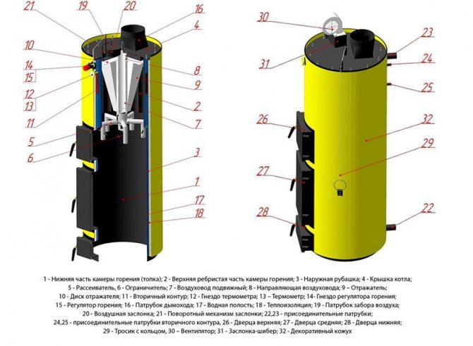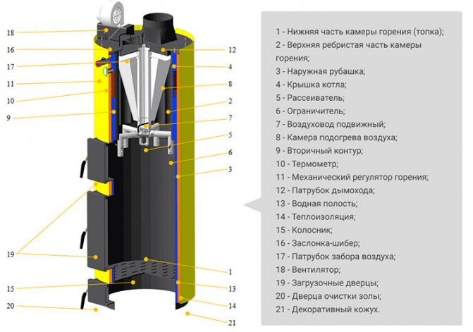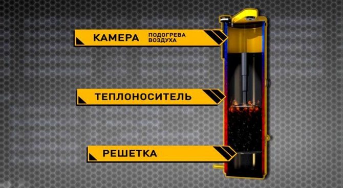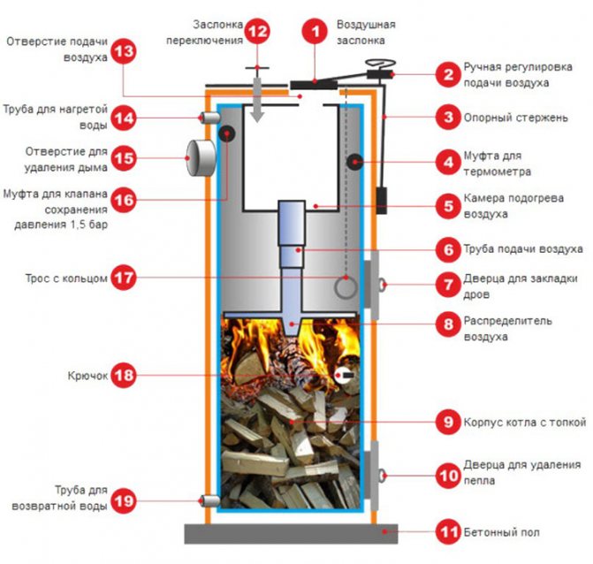 Construction traditionnelle en forme de four. Un réservoir métallique principal ou un appareil séparé connecté à un réservoir de stockage séparé est utilisé comme échangeur de chaleur. L'efficacité dépend de l'emplacement correct des éléments structurels, de leur taille, du système de régulation et du contrôle du processus de combustion. Le registre de tirage est installé dans une telle position lorsque le débit d'air d'échappement est suffisant pour empêcher l'entrée de produits de combustion dans la pièce. Une vitesse excessive des flux de convection n'est pas souhaitable, car l'énergie thermique n'aura pas le temps de fournir la quantité de chaleur requise à l'échangeur de chaleur. Le fort courant d'air soufflera de l'air chaud à l'extérieur. L'efficacité du système est réduite et la consommation de carburant est considérablement augmentée.