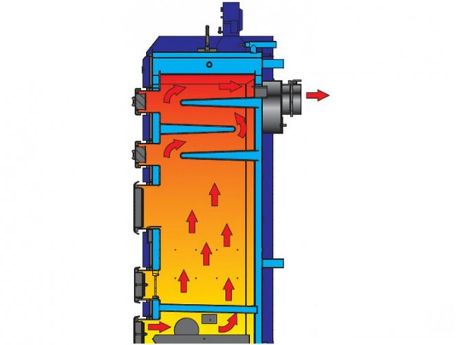 Les chaudières construites selon le type de pyrolyse sont plus complexes que leurs camarades à convection. Ici, nous voyons deux chambres - dans une, le bois de chauffage couve, émettant des gaz de pyrolyse, et dans la seconde, ces gaz brûlent à une température très élevée, atteignant + 800-1000 degrés. La chaleur dégagée est absorbée par le même échangeur de chaleur à tubes de fumée et partiellement par une chemise d'eau de protection (le cas échéant).