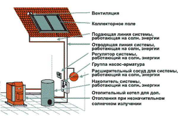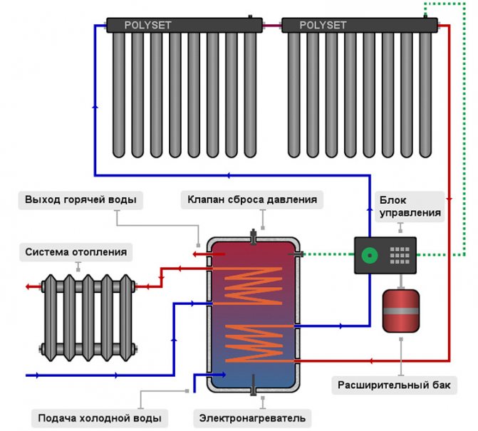 Le chauffe-eau solaire, qui est connecté à un réservoir de stockage de chaleur séparé, appartient au groupe des chauffe-eau pour une utilisation toute l'année. Le chauffage de l'eau est effectué à tout moment de l'année, à condition que le soleil brille toujours et que la température de l'air ne soit pas inférieure à -50 degrés. Pour le chauffage de l'eau, une chaudière de chauffage indirect externe est utilisée, située dans une zone éloignée du liquide de refroidissement. L'antigel est utilisé comme ce dernier. La production d'ECS par un collecteur avec ballon à distance s'effectue de la manière suivante: