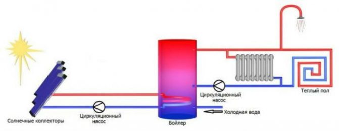 - Le collecteur du chauffe-eau est relié au moyen de canalisations à la chaudière de chauffage indirect. Là, l'eau est déjà chauffée, qui circule dans le circuit de chauffage ou d'alimentation en eau. Le liquide de refroidissement est mis en circulation par une pompe.
