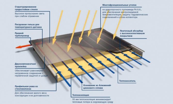 Il existe des chauffe-eau avec un principe de fonctionnement moins complexe. Dans les chauffe-eau à gravité, l'énergie thermique est transférée sans intermédiaire. Habituellement, dans leur conception, il y a une bobine (cuivre, aluminium) sur un substrat métallique ou sans elle. La paroi arrière du boîtier est revêtue de matériaux isolants thermiques. La batterie est reliée au réservoir de stockage au moyen de canalisations. La bobine et la plaque (également appelée absorbeur) sont peintes en noir pour une meilleure absorption de la lumière du soleil. Le dessus du boîtier est recouvert de verre, de polycarbonate, etc. Une isolation complète a également été réalisée pour empêcher les précipitations, la saleté et la poussière de tomber.