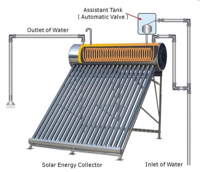 Pour obtenir de bonnes performances, un chauffe-eau solaire avec un réservoir externe est connecté à un groupe de pompage. La circulation du liquide de refroidissement est effectuée de force. Le processus de chauffage, la vitesse et la pression sont régulés par un système automatique. Le principal avantage de ces installations est une utilisation toute l'année.