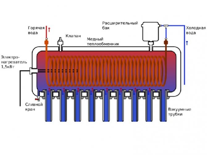 Dans certains caloporteurs, un élément chauffant intégré est utilisé, ce qui est nécessaire si le capteur solaire ne peut pas fournir le volume d'eau chaude requis. Un sous-refroidissement est observé en cas de mauvais temps et de froid. Le capteur solaire dans des conditions normales chauffe l'eau jusqu'à 200 litres par jour. Les appareils avec réservoir intégré fonctionnent sans pression grâce à la circulation naturelle de l'eau.