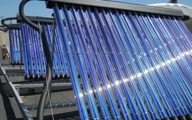 - Vide. Le liquide de refroidissement se trouve dans un tube scellé dans une fiole à vide. Cette ampoule est en verre de quartz qui transmet la chaleur solaire, ainsi que la lumière ultraviolette. Ce sont des conceptions très efficaces où les pertes de chaleur sont minimes. Si l'eau est utilisée comme caloporteur, le chauffage se produit à ébullition. S'il y a de l'huile là-bas, elle peut être chauffée jusqu'à 200-300 degrés. Presque tous les chauffe-eau à vide sont fabriqués en usine et sont assez chers;