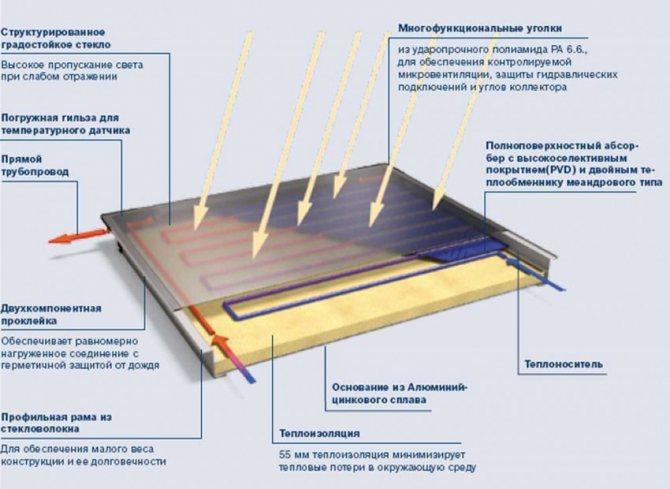 - Panneau. Le design est le plus simple. Le collecteur est peint en noir, logé dans un boîtier isolé et scellé hermétiquement avec du verre, du plastique, du polycarbonate, etc. L'efficacité est médiocre. En effet, le fluide perd une partie de sa chaleur lorsqu'il passe à travers le collecteur. Ces pertes sont généralement assez importantes. Les chauffe-eau solaires à panneaux sont bien adaptés aux régions à forte insolation solaire.