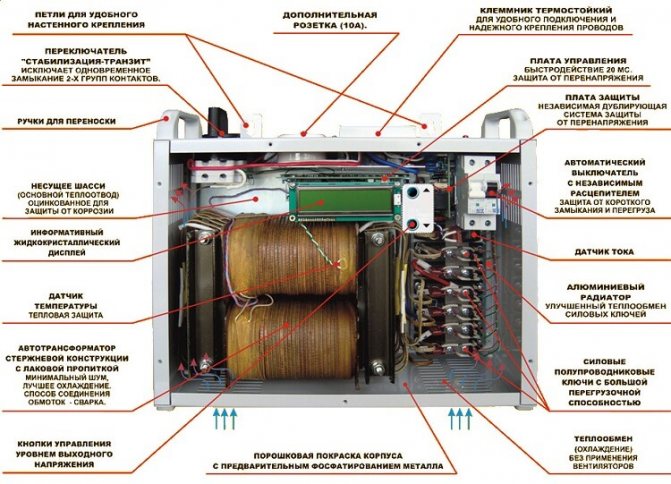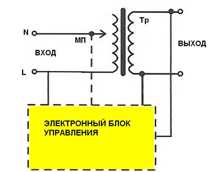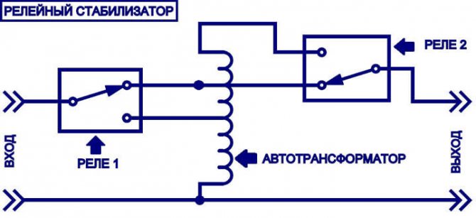 Le principe de fonctionnement d'un dispositif relais est similaire à celui d'un autotransformateur. La bobine de surpression connectée au réseau est divisée en sections à partir desquelles la surtension ou la sous-tension peuvent être supprimées. Le module de commande scrute en permanence la tension du secteur et, en cas de changement de tension à l'entrée, active le relais correspondant.