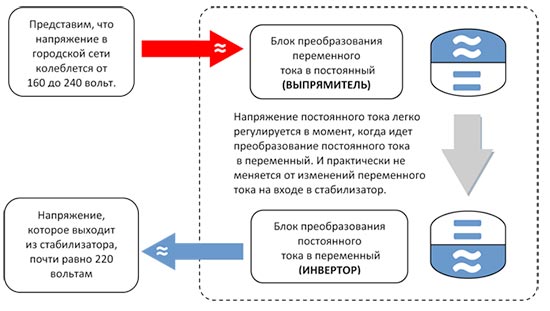 Le stabilisateur le plus progressif est considéré comme un dispositif de type onduleur ou stabilisateur à double conversion. Il manque un élément aussi volumineux qu'un autotransformateur. La tension alternative, ayant traversé le filtre, est redressée, tandis qu'une certaine énergie est stockée dans le condensateur. Ensuite, la conversion inverse du courant continu en courant alternatif est effectuée.