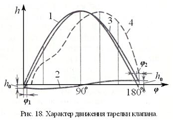 En figue. 18 montre une vue graphique de la dépendance (51). La sinusoïde 1 est construite en utilisant le premier terme sur le côté droit de l'équation (51), et le cosinus 2 est construit en utilisant le deuxième terme dans la même équation. En additionnant les ordonnées de la sinusoïde 1 et du cosinus 2, une courbe 3 a été construite, qui exprime la nature du mouvement du disque de soupape, c'est-à-dire le changement de sa hauteur de levée en fonction de l'angle de vilebrequin. La courbe 3 indique un écart entre les moments d'ouverture et de fermeture de la vanne avec les positions extrêmes du piston. Après que la manivelle ait fait un angle φ