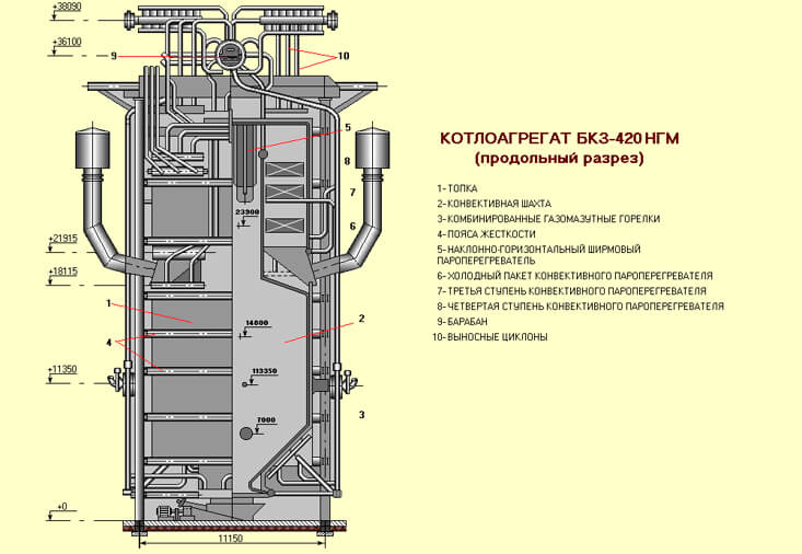 1 - chambre de combustion (foyer); 2 - conduit de gaz horizontal; 3 - arbre convectif; 4 - grilles de four; 5 - écrans de plafond; 6 - tuyaux de descente; 7 - tambour; 8 - surchauffeur à convection par rayonnement; 9 - surchauffeur à convection; 10 - économiseur d'eau; 11 - aérotherme; 12 - ventilateur soufflant; 13 - collecteurs inférieurs d'écrans; 14 - commode en laitier; 15 - couronne froide; 16 - brûleurs. Le schéma ne montre pas un collecteur de cendres et un extracteur de fumée.