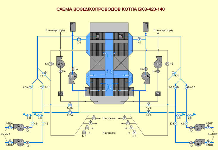 - La chaudière est équipée d'un réchauffeur d'air de type récupérateur, dans lequel l'air est chauffé en raison de la température des gaz de combustion à fournir au brûleur. Habituellement, un système de chauffage à air à deux étages est installé, avec une température allant jusqu'à 200 C.