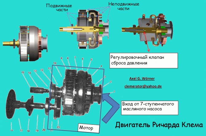Richard Clem, selon ses propres mots, testait une pompe à asphalte à la fin de 1972. Il a été alarmé par le comportement étrange de la machine après l'arrêt. Après avoir expérimenté avec de l'huile chaude, Richard est rapidement arrivé à la conclusion qu'il y avait quelque chose comme une machine à mouvement perpétuel. Un rotor de forme spécifique constitué d'un cône découpé par des canaux en spirale est équipé de buses divergentes. Tourné jusqu'à une certaine vitesse, a continué à bouger, ayant le temps d'entraîner la pompe à huile.