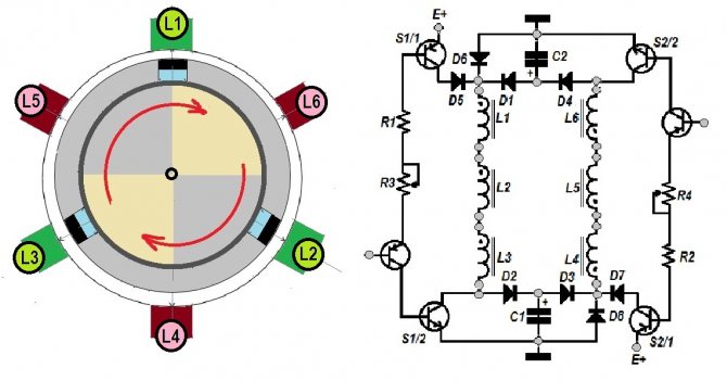 | "Escargot" du générateur de chaleur de cavitation en coupe transversale... Dans ce diagramme, vous pouvez voir les détails suivants: 1 - le corps, qui est creusé, et dans lequel se trouvent tous les éléments fondamentalement importants; 2 - arbre sur lequel le disque de rotor est fixé; 3 - anneau de rotor; 4 - stator; 5 - trous technologiques réalisés dans le stator; 6 - émetteurs sous forme de tiges. Les principales difficultés dans la fabrication des éléments énumérés peuvent survenir lors de la fabrication d'un corps creux, car il est préférable de le faire couler. Comme il n'y a pas d'équipement pour la coulée de métal dans l'atelier à domicile, une telle structure, bien que au détriment de la résistance, devra être soudée. | |