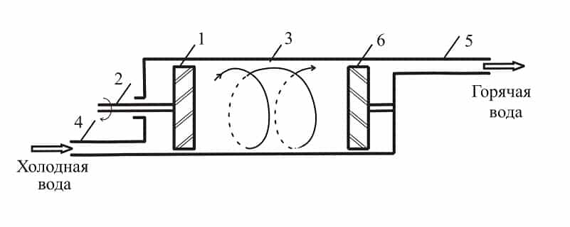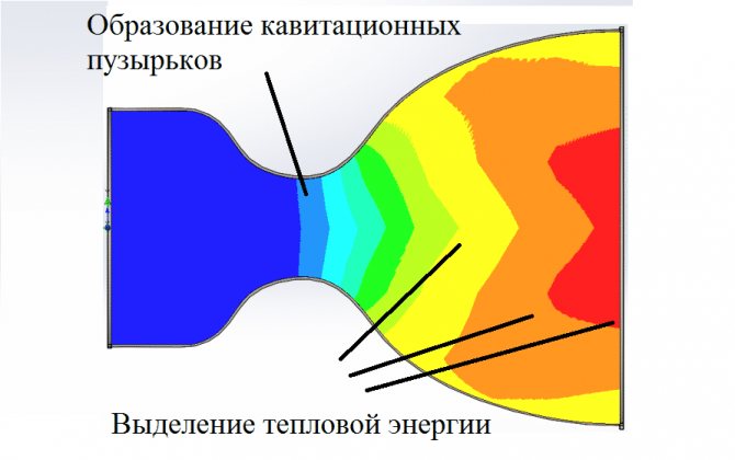 Lorsque les cavités de cavitation passent dans la zone de pression normale, les bulles sont détruites et l'énergie de leur destruction est libérée dans l'espace environnant. Pour cette raison, de l'énergie thermique est libérée et le liquide est chauffé à partir du flux vortex. Le fonctionnement des générateurs de chaleur est basé sur ce principe, alors considérons le principe de fonctionnement de la version la plus simple d'un réchauffeur à cavitation.