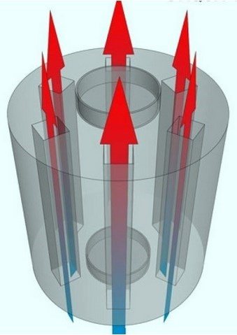 Par le bas, selon le principe de la convection, l'air froid entrant dans les buses, après chauffage, quitte la partie supérieure de l'échangeur de chaleur directement dans la pièce chauffée. Ce principe de fonctionnement permet d'augmenter considérablement l'efficacité du dispositif de génération de chaleur et de réduire la consommation de carburant de 2 à 3 fois.