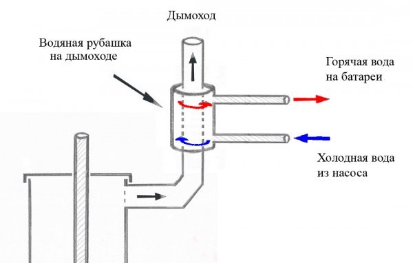 La combustion du mazout fournit une température de plus de 500 ° C à l'entrée de la cheminée. De tels indicateurs sont superflus, car la cheminée maintient le tirage même à 300-400 ° C. Sans endommager le poêle, une partie de la chaleur peut être redirigée vers l'eau de chauffage dans les systèmes de chauffage, l'approvisionnement en eau ou l'air intérieur. La fonction de l'échangeur de chaleur est d'assurer le transfert (échange) de la chaleur des gaz de la cheminée vers l'eau ou l'air.