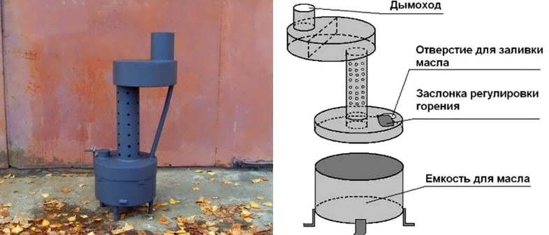 Un fonctionnement stable et sûr sera assuré par l'alimentation goutte à goutte de l'huile usagée. Ils sont fabriqués à partir de vieux cylindres, ainsi que de feuilles de métal. Le produit est fabriqué en fonction du type de combustion fermée, car dans la version ouverte, le carburant peut s'enflammer, ce qui entraînera une situation dangereuse.