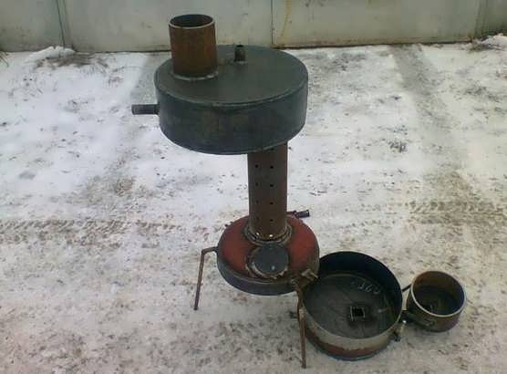 Réchaud fait maison alimenté par un combustible liquide, nommément huile de moteur usagée. La conception est discutable en termes de sécurité et pas très pratique à utiliser. Mais sur la base de telles structures, les artisans fabriquent des pistolets thermiques.