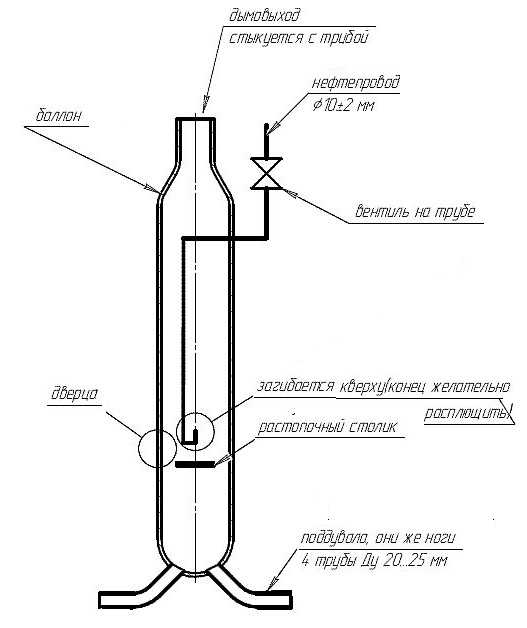 Une méthode de fabrication tout aussi simple est la construction à partir d'une bouteille d'oxygène ou d'une bouteille de propane. Pour commencer, préparez une perceuse, un ruban à mesurer, une meuleuse, une lime, ainsi que les coins en fer d'un tube fait d'un matériau d'au moins 2 mm d'épaisseur. Un conteneur de 10 litres pour le carburant sera également utile.