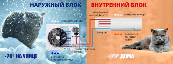 Une installation air-air reçoit également de la chaleur directement de l'environnement, et pour son fonctionnement également aucun collecteur externe requis... Après contact avec l'air chaud, le fréon se réchauffe, puis le fréon chauffe l'air dans la pompe. Ensuite, cet air est projeté dans la pièce, ce qui conduit à une augmentation locale de la température. Les appareils de ce type sont également assez bon marché, car ils ne nécessitent pas l'installation d'un collecteur coûteux pour leur fonctionnement.