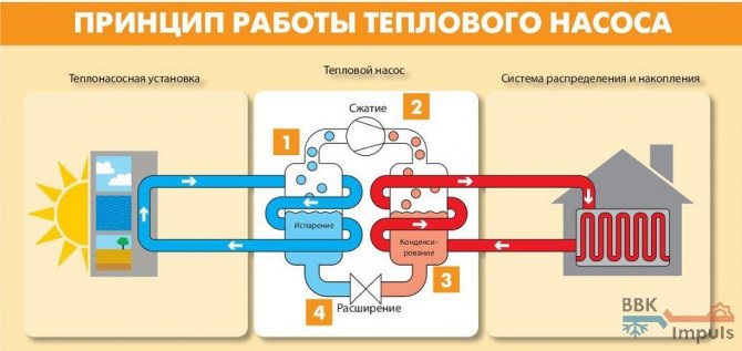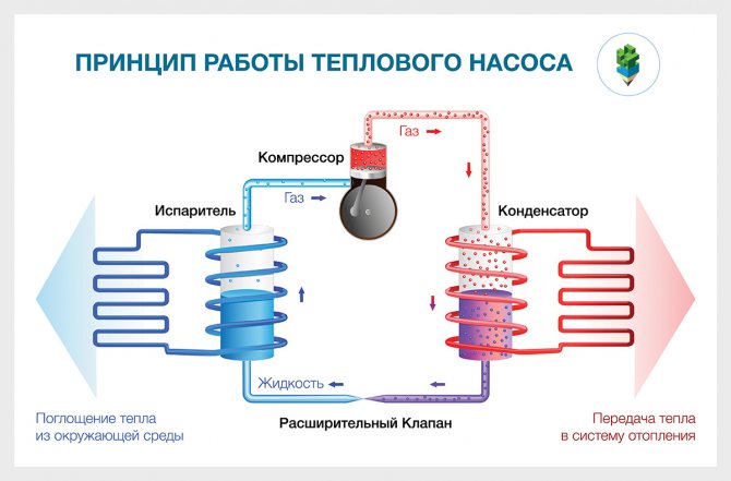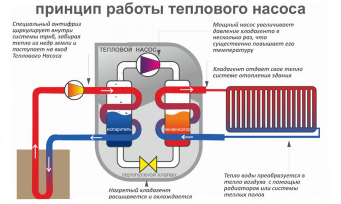 Nous avons un liquide de refroidissement qui se déplace dans le pipeline, où, en fait, il chauffe de 2 à 5 degrés. Après cela, le liquide de refroidissement pénètre dans l'échangeur de chaleur (circuit interne), où il libère l'énergie collectée. A ce moment, il y a un réfrigérant dans le circuit externe, qui a un point d'ébullition bas. En conséquence, il se transforme en gaz. Lorsqu'il pénètre dans le compresseur, le gaz est comprimé, ce qui fait que sa température devient encore plus élevée. Ensuite, le gaz va au condenseur, où il perd sa chaleur, la transmettant au système de chauffage. Le réfrigérant devient liquide et retourne vers le circuit externe.