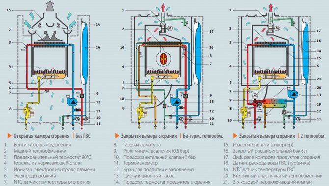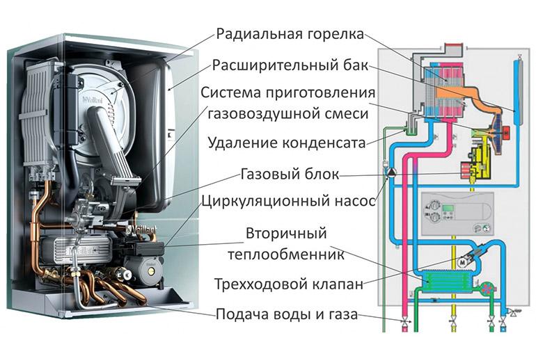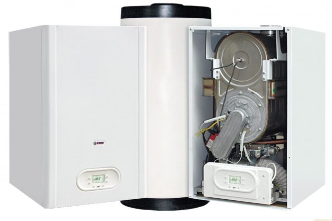 Lorsque le carburant brûle, une certaine quantité de gaz chauffés est libérée. Pour augmenter l'efficacité grâce à un transfert de chaleur accru, la conception prévoit le passage de ces gaz à travers les canaux où ils dégagent leur chaleur, augmentant ainsi l'efficacité. Ainsi, il est possible de réduire la température des gaz d'échappement à 100-120 ° C. Pour comprendre le fonctionnement d'une chaudière à gaz turbocompressée, vous devez comprendre le fonctionnement des équipements à combustion fermée.