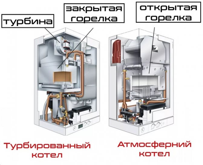 Lors de l'utilisation de chaudières atmosphériques, il y a une consommation de gaz accrue et des exigences d'installation strictes, réglementées par SNiP. De plus, les équipements atmosphériques ne doivent pas être utilisés dans des bâtiments à plusieurs étages et lors de l'installation, l'armoire ne doit pas être recouverte de décor. Dans une chaudière turbocompressée, la chambre de combustion est fermée. Un échange d'air forcé et une évacuation des gaz de combustion au moyen d'une turbine sont appliqués. Pendant le fonctionnement, l'air du four n'est pas utilisé pour la combustion du combustible.