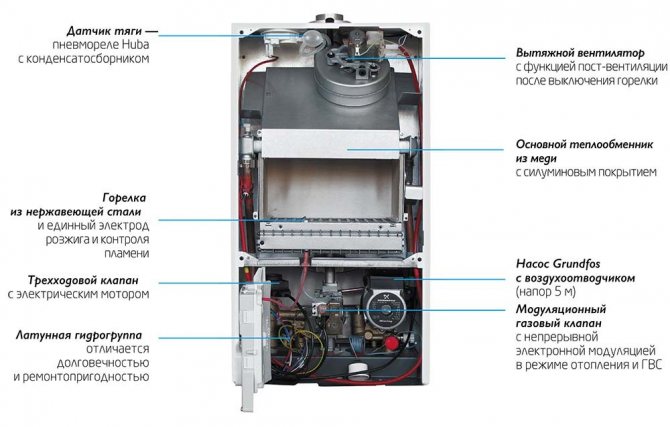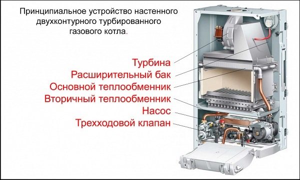 Le nom «turbocompressé» signifie que la chaudière possède une turbine, c'est-à-dire un ventilateur qui fournit de l'air, maintient la combustion et élimine les produits de combustion. La conception suppose un type de combustion fermée et un système d'évacuation des fumées à plusieurs tours.