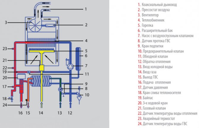 Les chaudières à turbocompresseur à gaz sont utilisées à la fois pour l'organisation de l'approvisionnement en eau chaude et pour le chauffage. Le chauffage du liquide de refroidissement dans un équipement mural de type bithermique est réalisé en chauffant de l'eau à partir de la chaleur générée par la combustion du gaz.Les chaudières à gaz à double circuit avec échangeur de chaleur à plaques chauffent le liquide de refroidissement à l'aide d'un circuit interne.