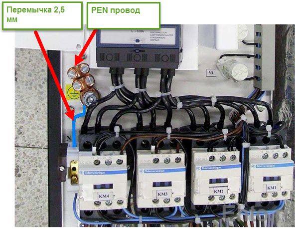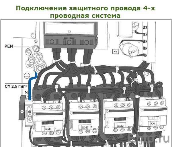 Si un la maison dispose d'un réseau à quatre fils, puis les conducteurs de phase sont connectés de la même manière et le conducteur PEN est connecté au connecteur à vis avec le symbole de terre. Dans ce cas, la pince de mise à la terre est connectée au connecteur neutre N avec un fil PV-1 d'une section minimale de 2,5 mm2.