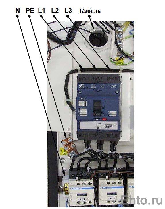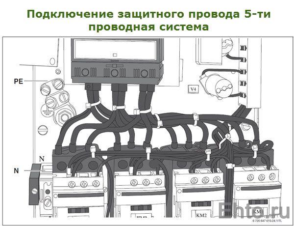 DANS réseau électrique à cinq fils les conducteurs de puissance de phase du câble sont connectés aux bornes d'entrée du disjoncteur principal de la chaudière. Le conducteur de travail zéro est connecté au connecteur marqué de la lettre «N». Le conducteur de protection du câble d'alimentation électrique est connecté au connecteur à vis, qui est indiqué par le symbole de terre.