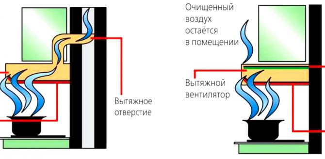 Les modèles de hottes à circulation (recirculation) se distinguent par le fait qu'ils n'ont pas besoin d'être évacués dans la ventilation à l'aide d'un conduit d'air, car le flux d'air est nettoyé en passant par deux étapes de nettoyage. Dans les hottes de cuisine avec filtre à charbon, l'air pollué passe d'abord à travers le filtre anti-graisse, puis à travers le filtre à charbon, après quoi il retourne dans la pièce.