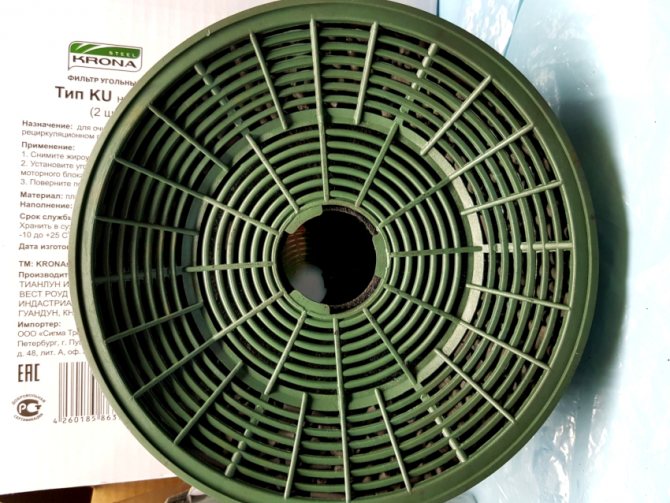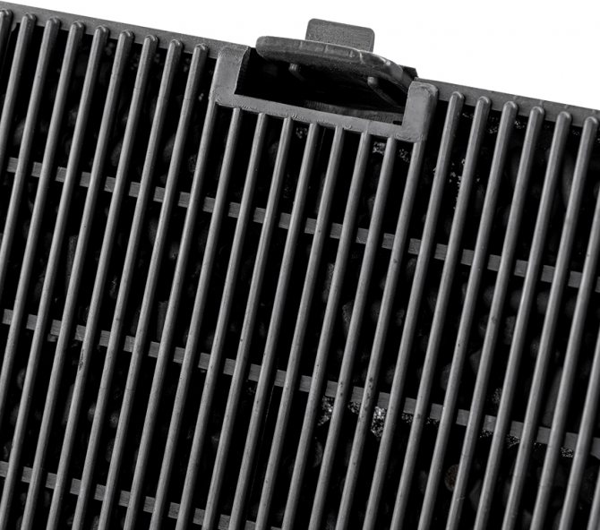 Dans une cartouche filtrante à charbon, l'ingrédient actif est de petits granules de charbon actif ou même de poudre de charbon, dont la caractéristique principale est la capacité d'absorber et de retenir diverses impuretés contenues dans l'air aspiré. En cas d'utilisation active, il est recommandé de changer le filtre de la hotte au moins une fois tous les 4 mois. L'élément de nettoyage est installé immédiatement derrière le tamis à graisse, ce qui le protège de la pénétration de grosses particules de graisse qui peuvent perturber le fonctionnement du sorbant de carbone.