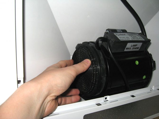 L'installation correcte du filtre est indiquée par un clic caractéristique. Si l'installation n'est pas effectuée correctement, il est fort probable que l'appareil ne s'allumera pas. De la même manière, à l'avenir, vous pourrez mettre à jour le contenu du filtre à charbon de la hotte de vos propres mains.