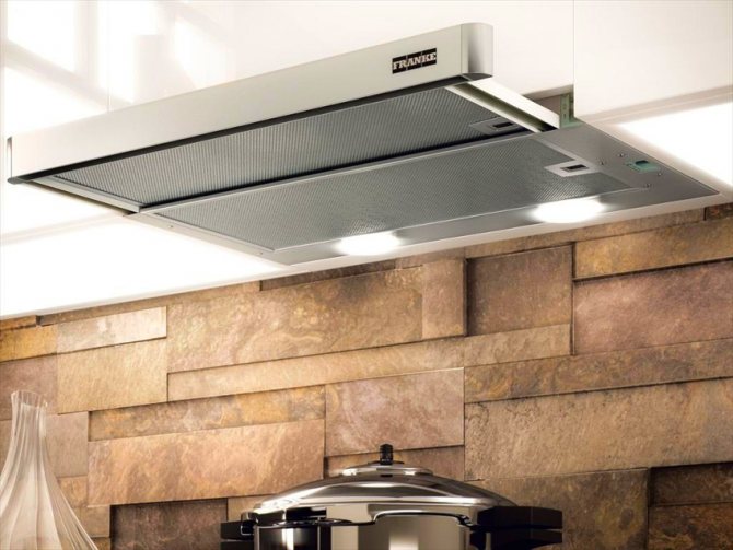 - Petite taille. Les hottes avec filtre à charbon occupent un minimum d'espace au-dessus de la surface du poêle, elles sont faciles à cacher même dans une petite armoire. Les curseurs occupent particulièrement peu de place, qui ne sont prolongés que pour la période d'utilisation.