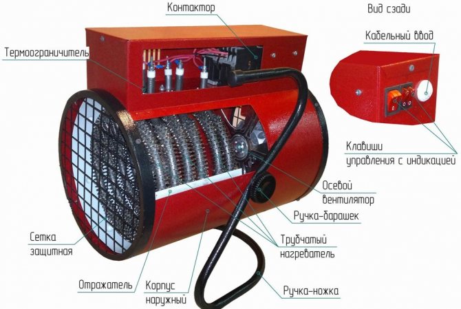 Dispositif de pistolet thermique électrique. (Cliquer pour agrandir) Un pistolet thermique électrique est un aérotherme assez fonctionnel, qui contribue à l'organisation efficace du chauffage des locaux à des fins diverses. Pour comprendre le fonctionnement d'un pistolet thermique électrique, vous devez tout d'abord connaître le schéma de son appareil.