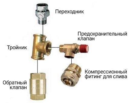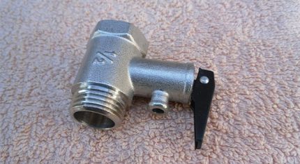 - Encore plus bas, il devrait y avoir une soupape de sécurité, qui a 2 fonctions: pour exclure le drainage de l'eau du réservoir, s'il est éteint dans le système d'alimentation en eau général, et lorsque la pression dans la chaudière augmente, libérer de l'eau.