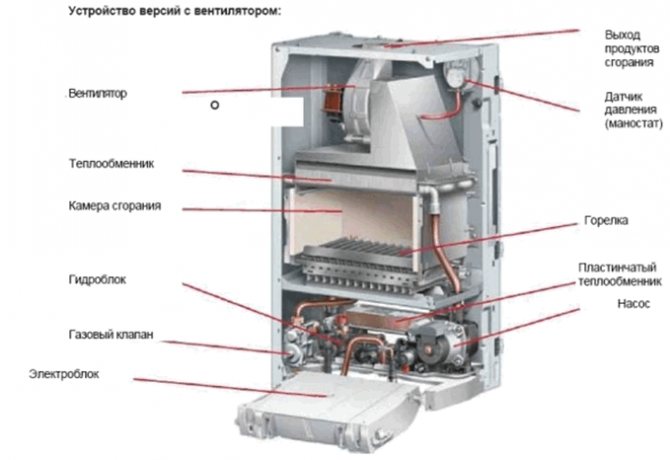 Une chaudière à gaz pour l'alimentation en eau chaude se compose d'un corps, d'une chambre de combustion avec une soupape explosive, qui empêche la destruction de l'appareil, du brûleur à gaz et de la section de convection. Selon le modèle de l'appareil, son ensemble complet comprend divers automatismes chargés de contrôler le système et de contrôler la chaudière.