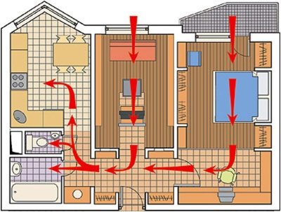 Essayons de répondre à la question "Qu'est-ce que la ventilation naturelle dans les locaux d'habitation?" La réponse est simple - il s'agit de se débarrasser de l'air sale, de le déplacer de l'appartement à la rue. Pour que ce processus ait lieu, des trous de ventilation dits spéciaux sont nécessaires. Le plus souvent, ils sont situés à l'endroit de la plus grande accumulation d'air et d'odeurs nocives. Cela peut être la cuisine ou les toilettes préférées de tout le monde (moins souvent une salle de bain, si elle est combinée avec une salle de bain). Quant à l'air pur, il pénètre dans la pièce par les fissures de la porte et de la fenêtre, diverses ouvertures. Et maintenant le roulement de tambour: vous avez installé du PVC et, comme vous le savez, il n'y a pas de fissures dans ces fenêtres, contrairement aux fenêtres soviétiques avec des trous. En conséquence, le processus de ventilation est bloqué. Et puis c'est ce qui se passe.