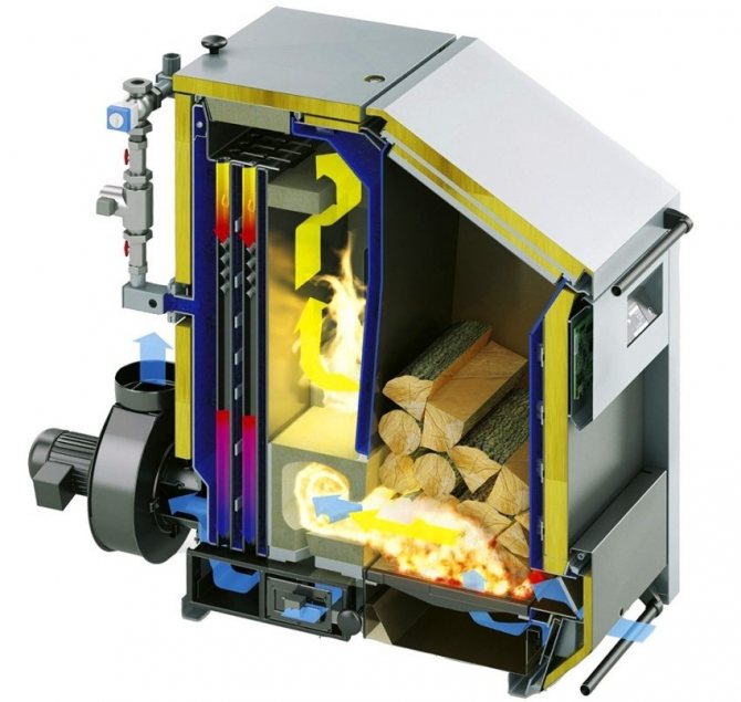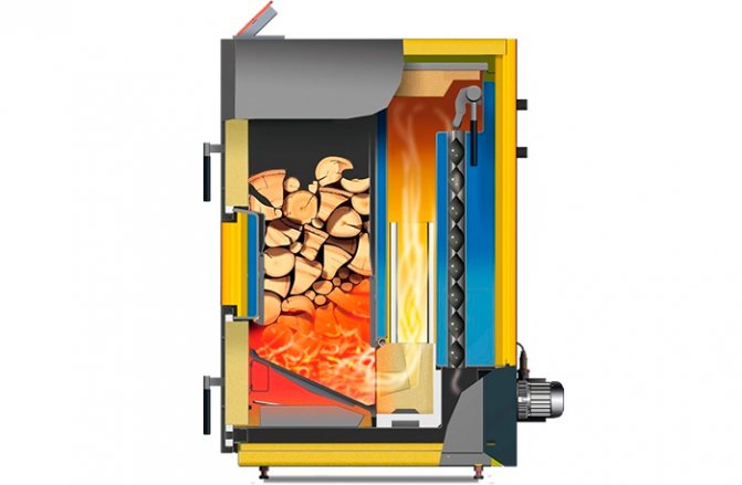 Le principe de fonctionnement de la chaudière à pyrolyse est quelque peu différent. Pendant le foyer, le débit d'air est limité, une combustion lente provoque la formation d'une grande quantité de gaz qui pénètrent dans les chambres supplémentaires et brûlent. Les chaudières brûlent n'importe quel combustible solide : charbon, bois, pellets. Une charge de charbon suffit pour cinq jours, du bois de chauffage - pas plus de trente heures. En raison de la combustion complète, ces chaudières ont un rendement élevé - jusqu'à 90%.