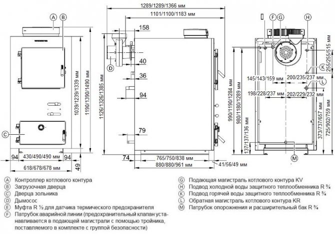 La conception proposée a une puissance de 22 kW, un rendement de 75 %. Il fonctionne au bois pendant 10 heures sans charge supplémentaire, au charbon - pendant une journée. Le foyer a un volume de 83 litres jusqu'au bord inférieur de l'ouverture de chargement. La chaudière est équipée d'automatismes fabriqués en Pologne: une unité de commande avec une sonde de température KG Elektronik SP-05 et un ventilateur DP-02. La vue générale est représentée sur le dessin.