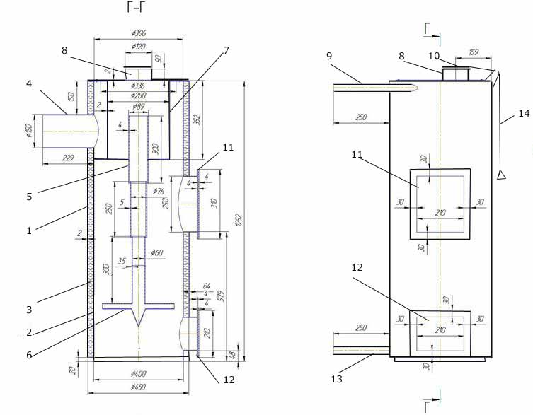 La partie principale de la chaudière est généralement comprise comme un corps fait maison, qui est divisé en plusieurs chambres. Des cloisons et des vannes sont réalisées entre elles, ce qui vous permet de réguler le volume d'air entrant dans la chambre de combustion.... Le corps est fait comme suit :