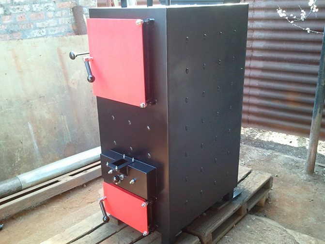 Une chaudière de mine à combustion conventionnelle est de conception plus simple. La moitié du volume total est occupée par un foyer d'une hauteur de presque toute l'unité, mais de faible largeur et profondeur. Sur le côté ou sur le dessus, il y a une trappe pour le chargement du carburant. Vue d'en haut, la chambre de combustion ressemble à une mine, d'où son nom. Un cendrier est situé sous la chambre de combustion, séparé de celle-ci par une grille. Par la porte du bac à cendres, l'accès s'ouvre non seulement à celle-ci, mais aussi à la chambre de combustion. L'entrée d'air est régulée par une grille située sous la porte.
